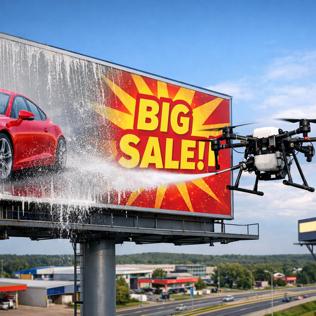 Hochgelegene Werbeanlagen, große Fassadenflächen, Dachkanten oder enge Standorte sind für Drohnen problemlos erreichbar – selbst dort, wo herkömmliche Verfahren an ihre Grenzen stoßen.